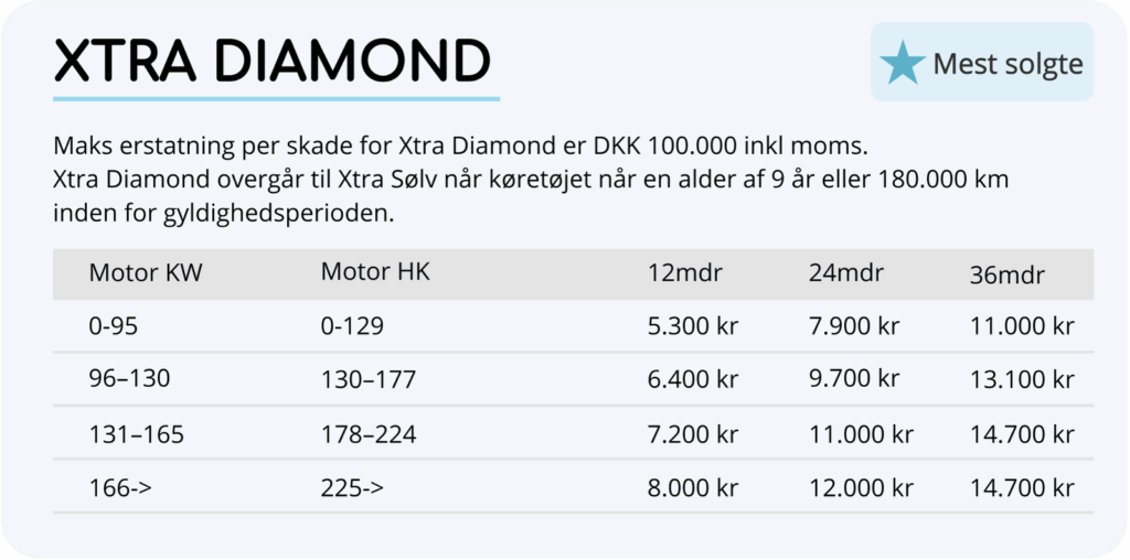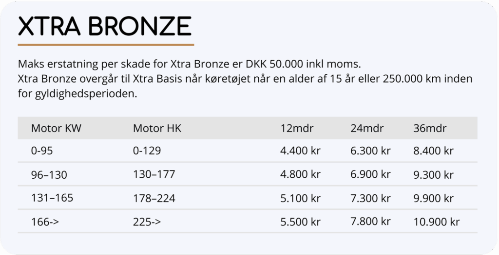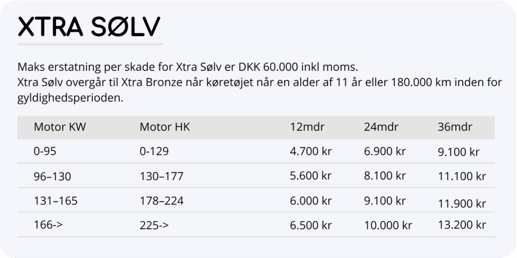 Vi tilbyder 4 forskellige dækninger, der er tilpasset din bils drivmiddel, alder og kørte kilometer.